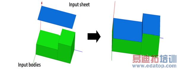To use the Project Sheet command you must select one planar sheet and at least one solid body. If you select multiple solids, the sheet is project on all bodies as if they have been united. After the commend executes, a new sheet that lies on the surface of the selected bodies is created. The solid bodies are not changed.