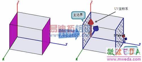设置主从边界条件时,主边界和从边界是分开单独设置的,下面以下图左侧图示的长方体为例,把长方体的左右两侧表面分别设置为一对主从边界条件。