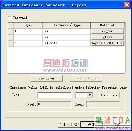 (4)如果分层阻抗边界条件定义在物体模型的最外层表面,不需要选中Internal复选框,如果分层阻抗边界条件定义在物体模型内部的表面上,则需要选中Internal复选框。然后,设置分层结构的层数、每一层的厚度和每一层的材料;使用 和 按钮可以添加和删除上面分层结构的层数。另外,作为可选项,可以在Impedance Value栏计算上面分层结构的阻抗值。最后单击 按钮,完成分层阻抗边界条件的设置。