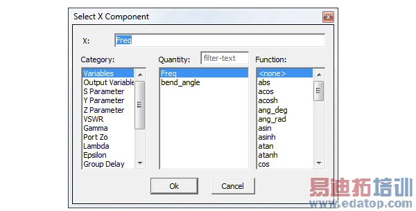 To select an X component that is different than the Primary Sweep, uncheck the Default field to enable the X field and browse [...] button. Click the browse [...] button to display the Select X Component dialog.