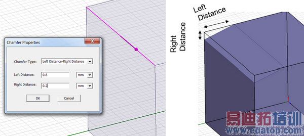 You control an asymetric chamfer by selecting a type that defines the chamfer asymetry as Left-Distance Right Distance, as Left Distance-Angle, or as Right Distance Angle. Notice that red directional arrows on the selected edges provide the direction against which left distance and right distance are determined.