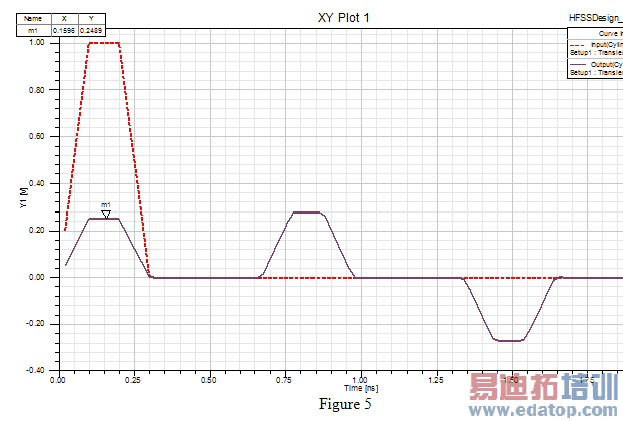 For an example where one might be more interested in the total voltage a second case was considered. The same HFSS Transient model was simulated with the same incident signal, but this time the port terminal impedance was set to 30 W. The HFSS Transient response for this simulation is shown in the Figure 5.