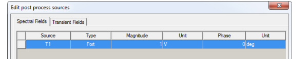 For Spectral fields, you can optionally include port post-processing effects. The Spectral Fields tab on Edit post process sources controls Frequency domain far fields and antenna parameters. The voltage specifications are only for the incident voltage.
