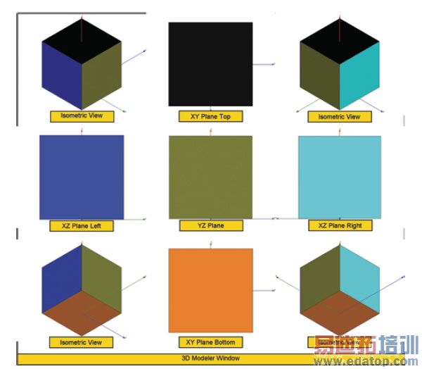 In the following figure, the orientation of the colored boxes shows the nine model orientations you can obtain by using Alt + double click in the corresponding area of the Modeler window.