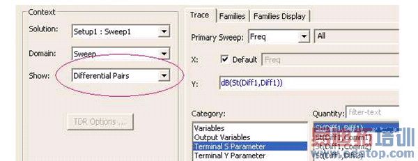 4. Show field with a drop down selection list for Differential pairs or Terminals. This field appears for designs using terminal solutions that have differential pairs defined. It lets you plot either differential pair data, or single-ended terminal data, or both in the same plot without having to disable or enable differential pairs under the Excitations heading in the Project tree. Note that single-ended quantities are computed as if no differential pairs existed. So in the unlikely case of several terminals where only a subset is combined into pairs, the results may not be as expected.