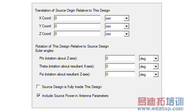 The antenna parameters include power-related entries such as incident power, accepted power, radiated power. If you check Include Source Power in Antenna Parameters the antenna parameters in the design that receives the fields from a source design will be based on a power set for the excitations in the source design under HFSS>Fields >Edit Sources. For instance, this can be the power with which a port in a source antenna is excited. If the antenna in a source design is excited with 10 W, then the antenna parameters panel in the receiving design will show an incident power of 10 W.