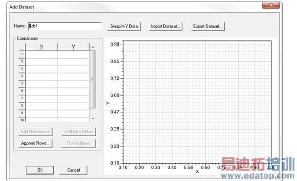 The dialog contains fields for the Dataset name, and a table for x- and y- coordinates. It contains a graphic display that draws a line for the coordinates you add. It also includes buttons for the following functions: