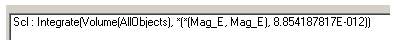 我以前是按这个式子算的,式子中少了系数0.5,所以算出的结果应该要乘以系数0.5。计算出来的值应该跟场分布计算显示的值一致。主要是按copy to stack(先选择Mag_E)两次,星号键,constant(选择Epsi0),星号键,Geometry(先点Volume再选择Allobjects),积分键,还有Eval键。如果身边有人会的,问下他们,教一下很快就会了。这里可能说的不清楚,不过按照这个式子多按几次,可能就会了。因为好久没用了,若有误,请各位指正。
