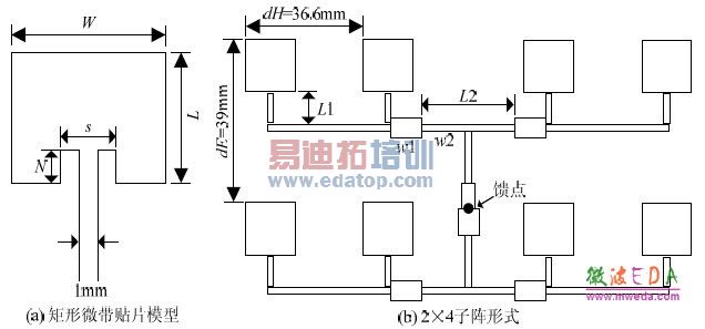 利用HFSS 进行微波无源器件及电路的设计大体经过物理建模、给模型参数赋予初值、运行仿真、参数调整优化等步骤。在进行计算机建模之前,需要经过详细的理论分析过程,利用微带天线工程设计的相关经验公式来确定相关尺寸数据,理论分析大体经历分析数据、全波仿真分析优化贴片尺寸、馈电网络设计等步骤。利用 HFSS 软件对由 RCL 馈电网络的2×4 微带子阵进行了仿真,建立的三维物理模型如图3 所示,通过数据后处理就可以得出全向电场方向图和全向增益方向图,分别如图4 和图5 所示。按照阵列天线方向图叠加原理和模块化的设计方法,可以得出4×24 结构微带阵列天线的整体E 面和H 面方向图,如图6 所示。