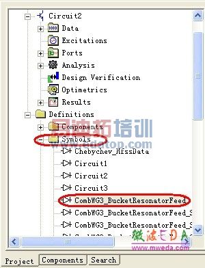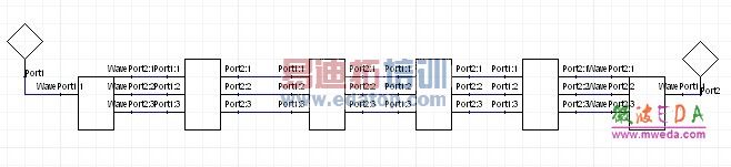 与例(一)中的操作相同,我们可通过在ADE 的电路原理图设计中插入子电路的形式将 HFSS 中基本单元连接进来。由于BucketResonatorFeed.hfss 的 waveport2 以及 Coupled-Bucket-Resonator.hfss 的两个waveport 都分别包含了3 个模式,因此当它以元件的形式导入电路设计时相应的waveport 也会对应3 个 Pin 脚。使用者可对 ADE 中的器件符号 进行自由的编辑,因此为了连接电路的方便,我们可对Pin 脚的位置做调整,并且还可为元件编辑更美观的符号。