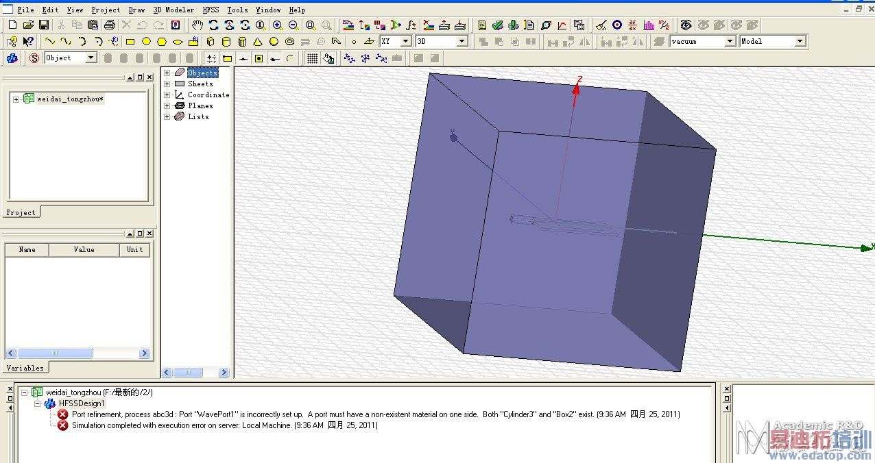 我仿真看了一下,这个要用lumpport,不能用waveport啊。仔细看错误提示