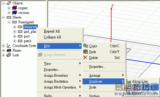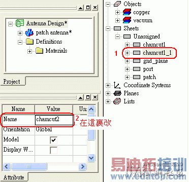 chamcut在切割后,藏到patch的subtract操作下了 从后面陆续的模拟实验中会发现,patch切边角是有特定作用的,可以让microstrip patch antenna原本很窄的频带略为放宽,但这三角切边也不能太大,如果ChamSize > DielectHight,会造成S11 plot上看到两个谐振频点(see step 4.6.5)