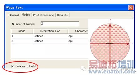 3)定义极化E场,对于圆波导或正方形波导,由于垂直极化和水平极化两个模式的截止频率相同,为了保证模式求解和我们计划的一致,可通过定义积分线,并将极化E选项选中,控制两个模式。图1.1(c)表示圆波导端口模式定义。