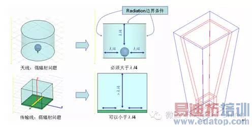 在计算天线等辐射问题时,辐射边界(Radiation Boundary)应在主辐射方向离开辐射体 的距离,在非主辐射方向离开辐射体 的距离,其形状可以与天线的形状共形,以便减少求解空间,例如,角锥喇叭的辐射区域可在建模时也作成角锥的形状,如图1.5所示。若辐射边界离辐射体距离 太近,会造成电磁波在辐射边界处的反射系数增大,电磁波能量未经充分吸收而反射回求解空间内,对求解结果的准确度造成影响;若辐射边界离开辐射体距离过 远,将使求解空间变得很大,这样会耗费更多的计算时间、增加收敛所需的迭代次数,降低求解计算的效率。