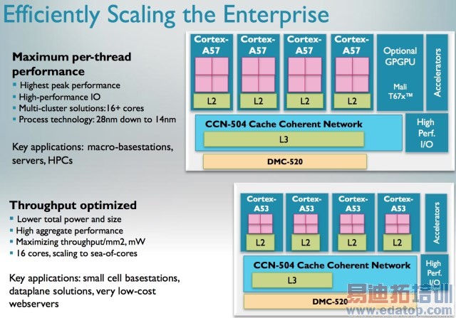 当然这还远未达到实用的阶段,而且它的诞生可能首先针对的也是需求较高的平板电脑甚至高级计算机与服务器。虽然相关技术将会逐步下放到手机市场。Cortex-A50系列芯片最早会在2013年底问世,然后才会导入产品。服务器可能是最快上市的产品,而有些芯片合作伙伴也积极尝试高端智能手机与平板计算机的可行性。