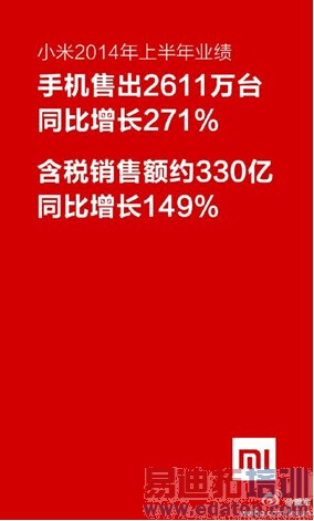 7月2日9点30分,小米公司董事长雷军在微博上公布了小米上半年的业绩。在今年上半年,小米共计销售了2611万台手机,同比增长271%,含税销售额约330亿,同比增长149%。这一数字超越了2013年的全年总和。