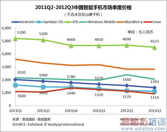 第3季度,从搭载各系统的智能手机均价变化来看,Android系从上季度的1560元,持续降低到本季度的1393元;Symbian系则从上季度的1170元降低到本季度的1114 元。同时iOS系从上季度的4690元降至本季度的4523元。