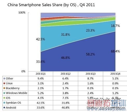 根据易观国际的数据,2011年全年苹果在华智能手机市场份额第二季度达到顶峰,为7.1%。与此相比,苹果2012年第一季度16%的市场份额显得尤为突出。