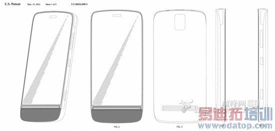 德国博客NokiaPort.de曝光了诺基亚的一项新设计专利。据悉,该专利在3月13日由美国专利和商标局(USPTO)授予,专利图如下: