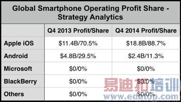 除了Android之外,苹果在智能手机平台上的其它竞争对手(包括微软和黑莓)在 2013 或 2014 年第四季度都没能实现盈利。