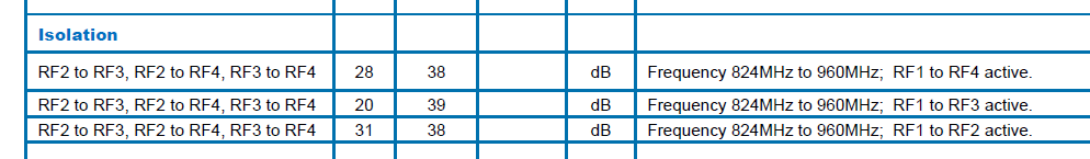 至于TDD下为什么要在max power下测试,我个人理解是,TDD工作会使用到开关进行TX/RX的切换,在开关切换到RX进行灵敏度测试时,PA由于有延迟,会有信号发射出来,泄露到RX通道,影响到灵敏度性能。因此你看天线开关,各个port口之间的隔离度也是有给出的。