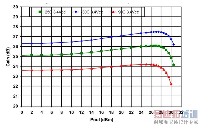 对比三条颜色不同的曲线,温度越高PA输出功率越低