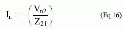 The relationship between noise sources Vn and In in Figure 3 and noise sources Vn1 and Vn2 in Figure 1b is derived as follows. Using Z parameters to represent the noise-free, two-port network in Figure 3: