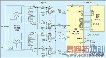 ADC(U1)和两片单电源供电的宽带、四运放(U2-U3),为RF正交调制器(一个差分、直流耦合的信号源)和高速ADC之间的模拟接口提供宽范围的输入共模电压。ADC具有足够高的信号噪声+失真比(SINAD)和无杂散动态范围(SFDR),用于宽带为3.84MHz的QPSK通信链路的检波。注意合理选择U2和U3的SFDR和输入共模范围。单电源3V供电时,U1的功耗是90mW。