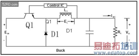 图1所示为一个降压拓扑结构电源的架构,该构架广泛应用于输出电压小于输入电压的系统。在典型的降压拓扑结构电路中,当开关(Q1)闭合时,电流开始通过这个开关流向输出端,并以某一速率稳步增大,增加速率取决于电路电感。根据楞次定律,di=E*dt/L,流过电感器的电流所发生的变化量等于电压乘以时间变化量,再除以这个电感值。由于流过负载电阻RL的电流稳定增加,输出电压成正比增大。