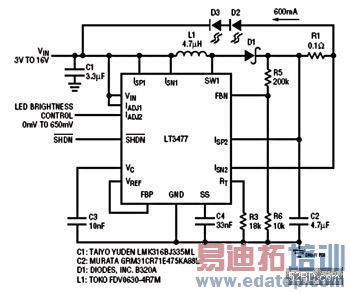 LTC3783和LT3477 LED驱动器于许多DC/DC架构上提供绝佳效能,将系统设计者从选择多个IC以因应不同照明应用的泥沼中释放出来。LT3477和LTC3783可能实现的架构包括降压、升压、降压-升压、SEPIC以及返驰。每一款LED驱动器都专门为从内部华丽灯光到外部前头灯等特定LED供电与电压需求而设计。LTC3783和LT3477都经Linear Technology的测试方法测试过,符合汽车电压与温度规格需求[2]。(作者为Linear Technology凌特电源管理产品行销工程师)