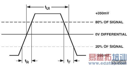 在表I中,ANSI/TIA/EIA – 644标准的规格对于信号转换时间的定义是:当资料信号率低于或等于200MHz时,信号转换时间必须低于或等于0.3 tUI。tUI的值是依据资料取样率的相反值来定义。在AD9430的例子中,最大的取样速率是210MHz,所以tUI的值就等于4.76ns。将tUI值4.76ns代入规格表里面的公式计算,0.3 x 4.76ns = 1.43ns。因此,差动信号的上升时间(tR)以及下降时间(tF),其总和应该要低于1.43ns。以AD9430而言,其上升及下降时间值都只有0.5ns。图5中所列举的是LVDS差动输出电压,其上升时间以及下降时间的定义。LVDS对于上升以及下降时间的定义,是以在最大信号强度的20%至80%之间变动的信号时间为依据,不同于CMOS输出的上升下降时间,其定义通常是在10%至90%之间。
