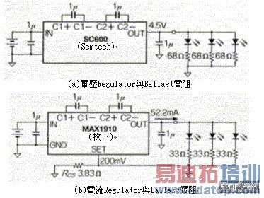 图3(a)的电路分别使用可以控制LED电流的电压Regulator与Ballast电阻,这种电路的优点是电压Regulator种类非常丰富,设计者可以选择的自由度较多,而且与电压Regulator、LED的接点只有一点;反面缺点是Ballast造成的电力损失会导致效率恶化,此外LED的顺向电流也无法获得精密控制。