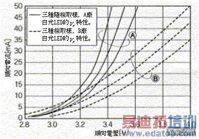图1是从A、B两家LED厂商的产品中随机取样三种白光LED,进行顺向电压与顺向电流特性检测的结果。根据检测结果显示若利用3.4V顺向电压驱动上述六种白光LED时,顺向电压会在10mA~44mA范围内大幅变动。