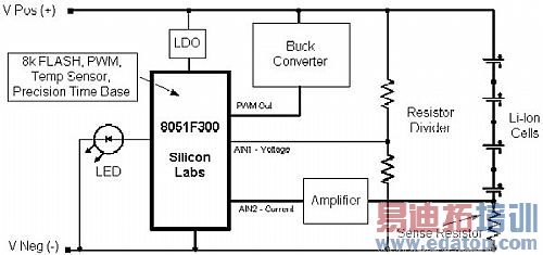 利用8位元微控制器C8051F300和它内建的类比数位转换器、快闪记忆体、脉冲宽度调变器、温度感测器以及精准时钟电路,即可设计出适当的充电电路。图3所示即为这类充电器的方块图,晶片内建高速类比数位转换器提供准确的充电电压监测功能,用来避免过度充电,并提供最大的充电有效性和电池寿命。晶片内建比较器和PWM则为高速降压转换器的实作提供必要功能,使它们只需要一颗很小的外接电感。晶片内建温度感测器提供稳定的驱动电压,可用来判断电池温度;若有必要,它也能使用外接的电阻性温度感测元件。最后,这颗微控制器还提供组态配置及程式设定功能,这使它能支援不同类型的电池,协助客户减少零件库存,加快新产品上市时间。
