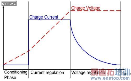 要判断电池是否已充满电力,绝大多数的锂离子充电器会将电池电压保持固定,然后监测最小的电流值,图2即为充电曲线,它是利用降压转换器实作所得到的最有效曲线,这个降压转换器是一种交换式稳压器,它会使用电感或是变压器做为储能装置,然后以个别封包的形式把能量从输入端送到输出端。回授迴路则会透过电晶体来调节能量传送,以便在电路的负载范围内维持定电压或定电流。
