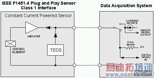 Class 1介面主要用于持续电流供电的压电变换器(加速度计,麦克风等等),并且定义了一个流程,可以顺序地在一对变换器线路的模拟模式和数字TEDS模式之间切换。持续电流供电变换器(通常被称为整合电子压电 (IEPE) 变换器)整合了内部信号调节,由信号线路上的量测系统提供稳定的电流作为动力。Class 1 变换器透过一个由电流来源方向控制的开关来加入TEDS的功能(如图二所示),以利用这种实质上的标准的优势。只要改变电流的方向,仪器系统即可将感测器数字TEDS模式。