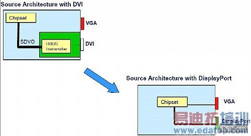 图3 今日过半PC已在晶片组中内建视频功能,视频信号直接自晶片组接脚输出,但随着半导体制程技术的提升,晶片组的逻辑输出准位愈来愈低,对此需要进行信号转换才能符合DVI标准,然DisplayPort已能支援先进制程,不需转换即可输出。(图片来源:VESA.org)