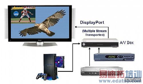 图4 DisplayPort运用微封包架构的特性可轻易扩展各种视频延伸应用,图中以一部A/V Box接收、汇整多个视频源,然后以单一的DisplayPort接线输出至TV,该接线可同时含带多组视频源的视频内容,并在TV上以缩放、子母影像方式呈现。(图片来源:VESA.org)
