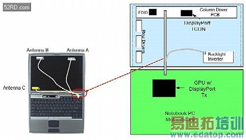 图2 DisplayPort对Notebook/Laptop而言的益处是缩减内接传输线路数,XGA的视讯水准可自16条减至2条,UXGA则可从20条减至8条,线路精省后所腾出的佈线空间可有更多的其他发挥应用(如佈设RF天线)。(图片来源:VESA.org)