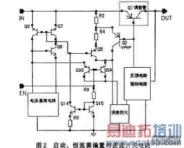 该稳压器包括启动电路、恒流源偏置单元、使能电路、调整元件、基准源、误差放大器、反馈电阻网络,保护电路等。为了实现LDO特性稳压器调整元件采用一种自由集电极的纵向PNP管,过温过流保护电路也采用了特殊的结构。电路拓扑结构如图1所示。
