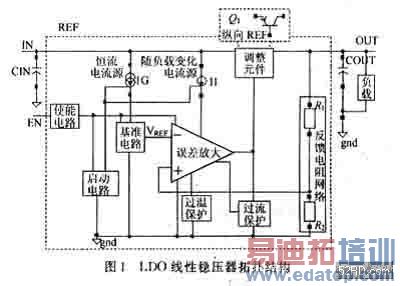 基本工作原理是这样的:系统加电,如果使能脚处于高电平时,电路开始启动,恒流源电路给整个电路提供偏置,基准源电压快速建立,输出随着输入不断上升,当输出即将达到规定值时,由反馈网络得到的输出反馈电压也接近于基准电压值,此时误差放大器将输出反馈电压和基准电压之间的误差小信号进行放大,再经调整管放大到输出,从而形成负反馈,保证了输出电压稳定在规定值上;同理如果输入电压变化或输出电流变化,这个闭环回路将使输出电压保持不变,即: