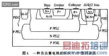 如图3所示LDO线性稳压器简化的结构图,稳压器的静态工作电流(Iq)主要由调整管的基极驱动电流决定,该值越小,则稳压器自身消耗的电流越小,电源电流转换的效率就越高;漏失电压(VDROP)指输出电压在容差范围内的最小输入输出压差,该值越小,则电源电压转换效率越高。对于采用PNP调整管的LDO线性稳压器,Iq≈IDRV=IO/β(β为PNP的电流放大倍数),VDROP=VSAT(VSAT为PNP的饱和压降)[1]。由于在现有工艺下,一般横向PNP的电流放大倍数为50左右,参数漂移较大;VSAT的性能也不好。此设计采用了某工艺下一种自由集电极的纵向PNP,标准单管在集电极电流为-100μA、集电极与发射极压差为-5 V时,β为160,上下漂移50;在集电极电流为-100μA、集电极与基极电流比为10时,VSAT为30 mV左右。因此这种自由集电极的纵向PNP非常适合作调整管。单管的版图剖面结构如图4所示。漏失电压和静态电流电流特性如图5、图6所示。