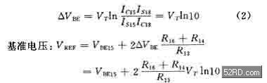 Q15,Q18,R13构成VT(VT=KT/q,称为热电压)发生器,Q19,Q16和Q17构成的电流源精确地保证Q15和Q18的集电极电流相等。Q15,Q18的发射区面积比为1/10,则他们的结饱和电流IS之比为1/10,因此Q15,Q18的BE结压差ΔVBE为: