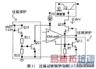 过流保护电路与过温保护电路有点类似,在稳压器的工作电流范围内,Q11截至,当稳压器输出电流增大到200 mA时,此时调整管的基极电流将达到2 mA,电流检测电阻R7上的压降将使Q11导通,形成负反馈,把输出电流限制在这个值上。