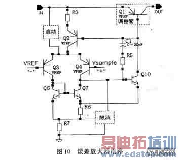根据以上所述,本文给出如图10所示的设计电路,误差放大器输出电流在小电阻R6上的压降控制Q4的动态负载,当稳压器输出负载电流增大,则误差放大器输出电流增大,R18上的压降升高,而使动态负载增大,这样才能给调整管提供更大的驱动电流。此设计的误差放大器的差分输入对管与调整管同为自由集电极的纵向PNP,这使误差放大器具有高传输跨导,低输入失调[5]。