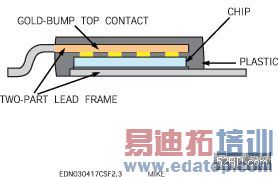 日立公司和飞利浦公司都使用LF-Pak (图 3),LF-Pak遵循相同的原理,即位漏极接触点占据封装下表面的大部分,源极接触点有点像通过金凸块连接到管芯的顶部的第二个引线框架。日立公司的数字表明,与SO-8相比,这种结构使沟道到外壳的热阻从50oC/W降低到3oC/W,并使电阻和电感比减小一半左右。飞利浦公司的电源产品销售经理Ian Moulding将这一结构描述为将管芯"夹在中间"的引线框架。飞利浦公司生产的最受欢迎的器件之一就是导通电阻额定值为8.2 mW的FET;当你将该器件用作同步降压型变换器布局中的控制FET时,该器件可在栅极电荷与电阻之间提供最好的平衡。飞利浦公司正在将这一原理推广应用于称为"m-TrenchMOS"系列的小型器件中。比如,该公司将铜引线框架放入SOT-23封装中,以制作可为薄型LCD显示板和PCMCIA卡等器件提供4~5A电流的薄型负载点变换器。Moulding说,这些小型封装中的焊接线是提高性能的限制因素。