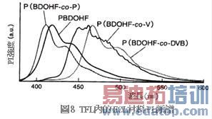 此处将可以溶解高分子材料的Tetrahydrofuran(THF)当作溶媒,进行所谓的PL频谱(激发光波长:365nm)量测,其结果图8所示,P(BDOHF-co-V)与P(BDOHF-co-DVB)发光波长极大时的波长,若与PBDOHF比较,两者分别朝长波长侧移动40nm与50nm左右,呈现略带绿色发光,该现象显示fluorene环之间混有乙烯或是Divinylbenzene的分子,所以它的共役长会变长。