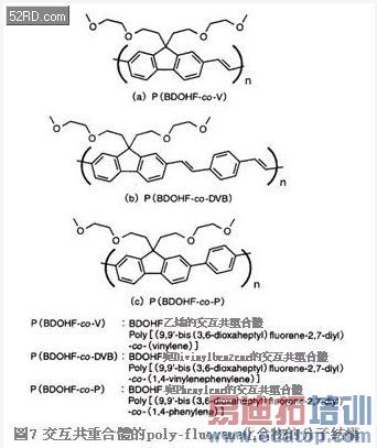众所周知,萤光(PL: Photoluminescence)频谱的发光波长与共役长的长度有依存关系,因此对ECL造成对发光色的影响备受期待,研究人员针对与PBDOHF比较时预料共役长可能会伸长的BDOHF、乙烯(ethylene),以及Divinylbenzene与Phenylene交互共重合体进行检讨(图7)。