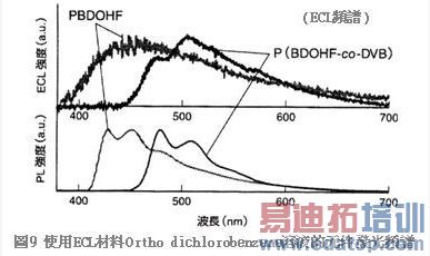研究人员使用可以使电流更容易流动含有0.1wt%支持塩的Ortho dichlorobenzene,与PBDOHF或是5wt% P(BDOHF-co-DVB)高浓度混合溶液制作ECL元件(device),接着照射波长为365nm的激发光,依此量测PL的频谱,其结果如图9所示,虽然THF内的频谱与形状略有差异,不过50nm长波长化现象完全没有改变。