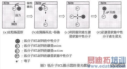 如图3所示,低分子ECL显示器的发光机制,一般认为同等的Rubrene时,激发anion与激发cation的移动度可以成立;不过在PBDOHF的场合,激发cation非常不稳定,因此必须考虑由溶媒分子负担,它表示激发anion与激发cation的移动度并不相同,具体而言,电极附近生成的PBDOHF的激发anion为高分子,因此它的移动度很低,可能会停留在电极附近(图5a);相形之下,电极的极性反转后生成的溶媒分子的激发cation